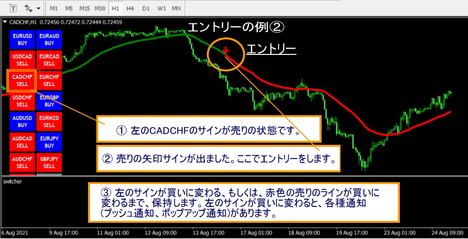 サインが点灯しましたら、各種通知がありますので的確なタイミングでエントリーできます。全通貨対応で、表や文字の大きさの変更、表示位置の変更もできます。
