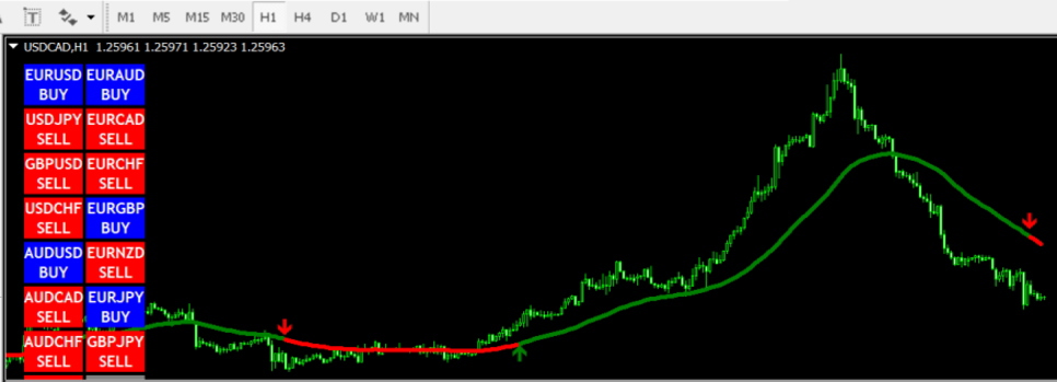 上矢印の出現で買いトレンドの始まり、下矢印の出現で売りトレンドの始まりになります。赤のラインが売りトレンド、緑のラインが買いトレンドです。