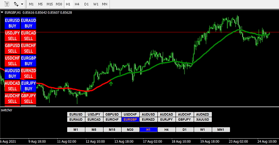 買いトレンドになりましたら、チャートの左の通貨が青色になり、買いサインが表示されます。売りトレンドになりましたら、チャートの左の通貨が赤色になり、売りサインが表示されます。 サインがない時は、グレーのサインが表示されます。