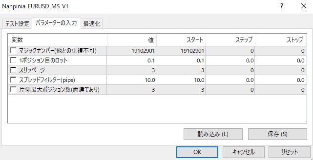 100万円でパラメーター「1ポジション目のロット」設定0.1ロットを推奨とします。