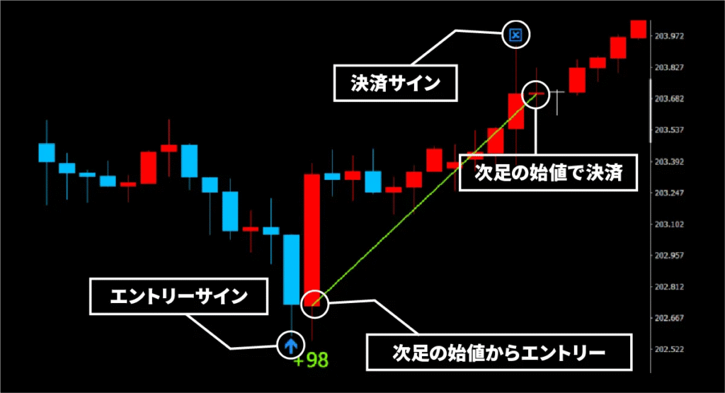 決済サインが出現したらポジションを決済します。エントリーサインから決済サインまでがラインで結ばれ、そのトレードで獲得したPIPS数がチャート上に表示されます。