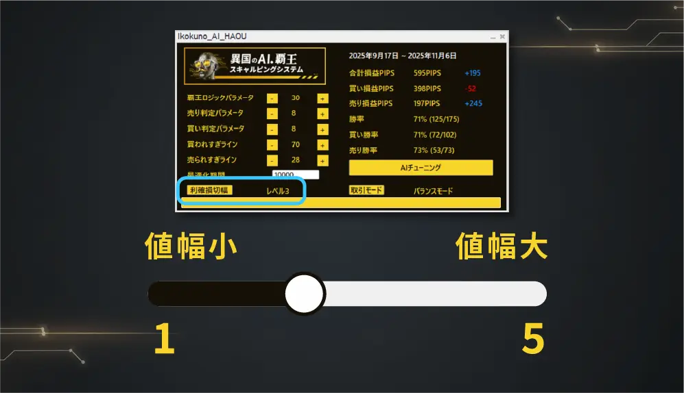 AIチューニング時に、利確・損切幅レベル(1~5段階)を設定できます。小さい数値では、細かい値幅を狙うトレードに。大きい数値では、大きな値幅を狙うトレードになります。取引スタイルや相場の見方に合わせて、AIの判断基準を調整できます。
