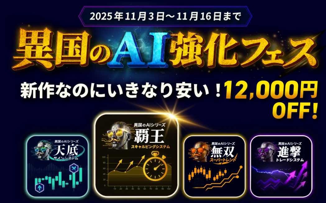 「対象商品」:【AI.天底サインシステム】【AI.無双スーパートレンド】 【AI.進撃トレードシステム】 【異国のAI.覇王スキャルピングシステム】(最新作ですがセール対象商品となっています。