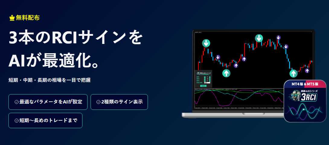 【異国のAI.3RCI】は3本のRCIサインをAIが最適化できるMT4/MT5版の無料インジケーターです。【異国のAI.3RCI】を使用することで3本のRCIを表示(短期・中期・長期)だけではなく、AIの最適な設定、適切な使い方など従来RCIの悩みを全て解決。