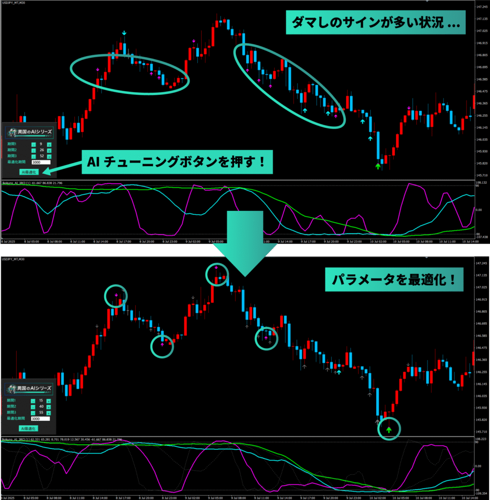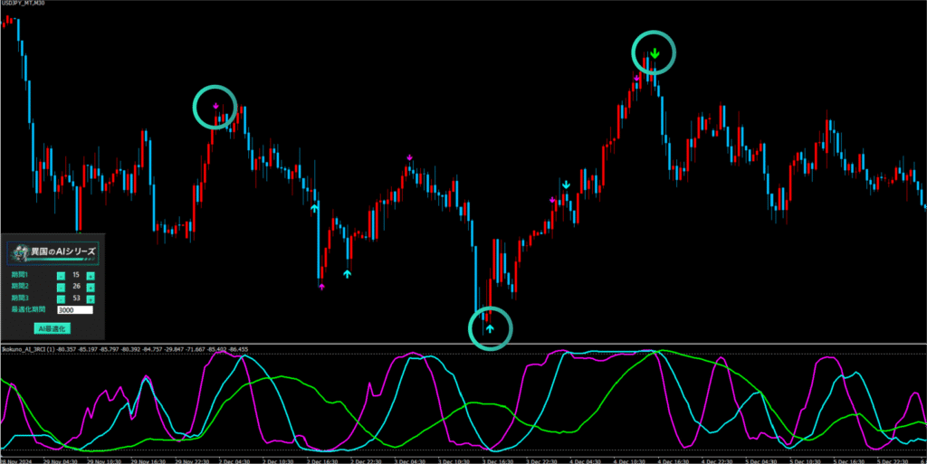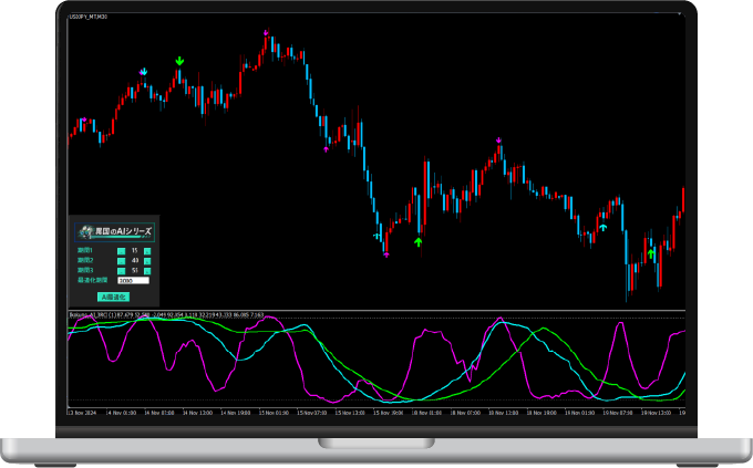 さらにAIが過去の相場を分析しパラメータを最適化。精度の高いサインをリアルタイムで表示します。