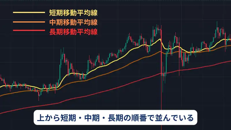 FXのパーフェクトオーダーとは、3本の移動平均線が上から短期・中期・長期の順番で並び、3本の移動平均線の傾き(右肩上がり・右肩下がり)が一致している状態を指します。