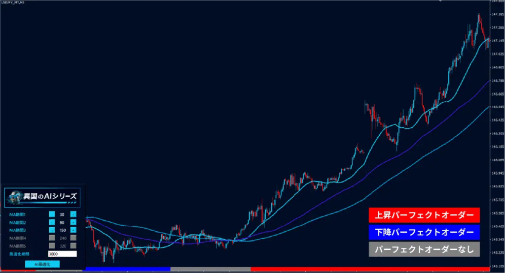 【AIシンプル移動平均線】は、過去のチャートデータを解析し、最も安定的にパーフェクトオーダーが継続するMA設定をAIが導き出します。