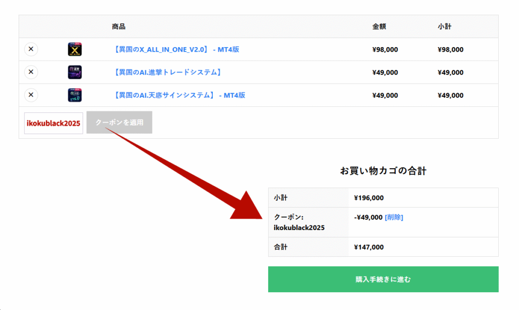 商品をカートに入れてチェックアウトに進むときに、クーポンコード「ikokublack2025」を入力して適用すると、カート内の全ての商品が25%OFFとなります。
