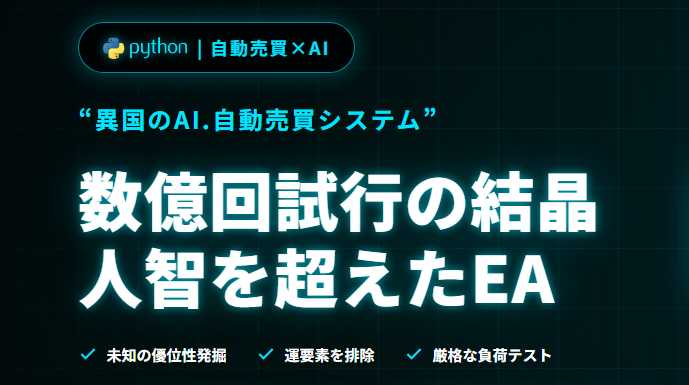 【異国のAI.自動売買システム】は、Pythonとデータサイエンスを用いた高次元のEA開発を実現した、数億回に及ぶ試行の末に生み出された次世代EAです。人間の直感を超え、数億通りものパラメータ探索を行い、スプレッド拡大や悪条件相場を想定した厳格な検証も実施しました。無駄な拘束時間を排除し、リスクを低減することで、「過去相場にしか通用しないEA」という常識を脱却した最新型の自動売買システムです。