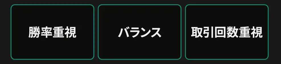 AIチューニング時に、3つの取引モード(バランスモード/勝率重視モード/取引回数重視モード)を選択できます。選択したモードに応じて、AIが生成するサインの傾向が変化し、取引スタイルに合わせた最適なシグナルを提供します。