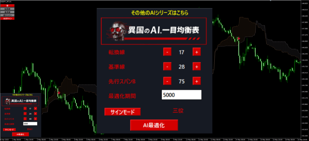 【異国のAI.一目均衡表】では、任意の期間を指定してAIに過去相場を解析させることで、現在の傾向に最も合致したパラメータへ自動更新されます。