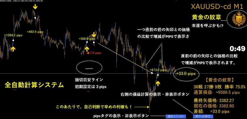 ・ 画面右に、チャート上の全矢印による取引の勝率と損益が累計表示される。