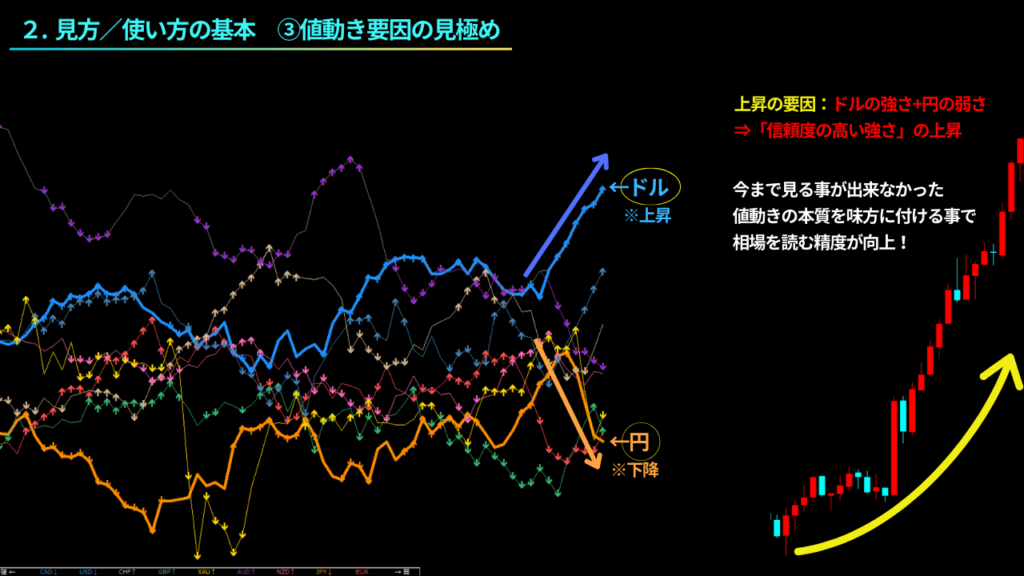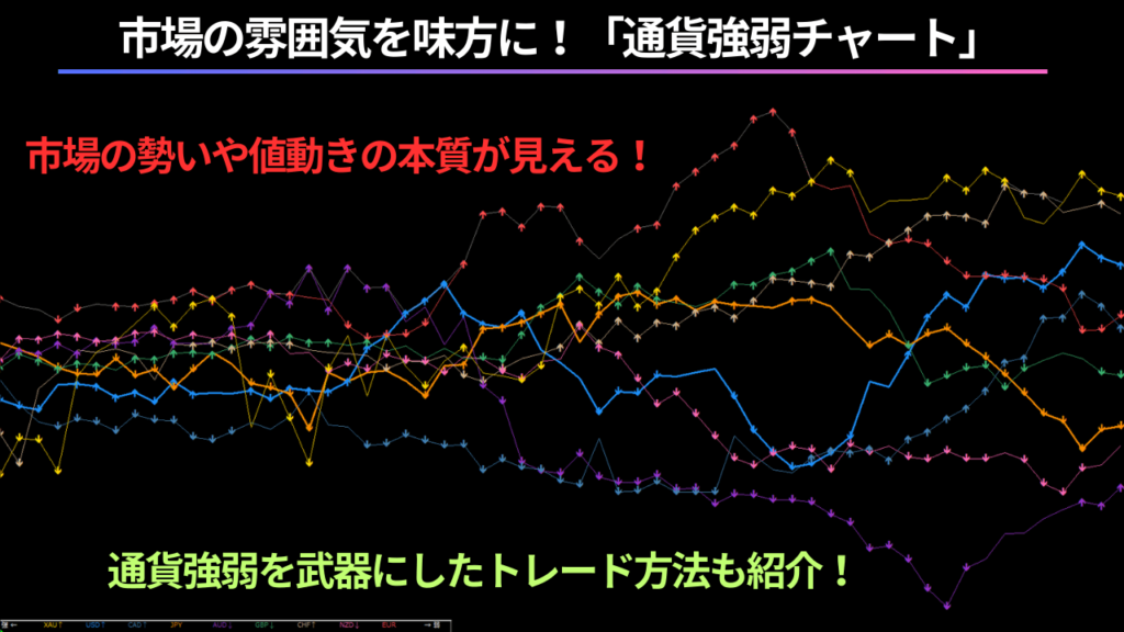 通貨ペアそのものの動きだけではなく、それぞれの通貨が市場全体の中で強い状況にあるのか、弱い状況にあるのかという本質が見える事で、強い根拠を持って値動きを分析する事が出来ます。