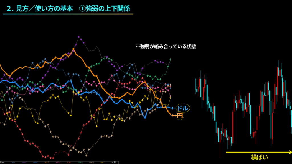 理由は、取引通貨ペアの2本のラインの強弱関係だけではなく、為替市場全体の状態を把握して欲しいためです。市場全体に勢いがあるのか落ち着いているのかを見て欲しいのです。