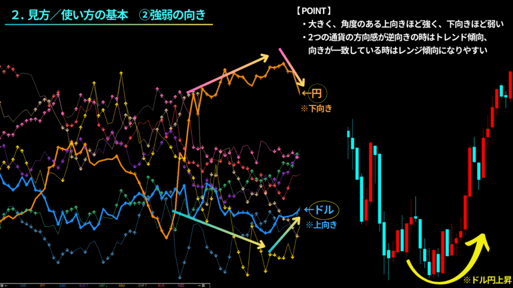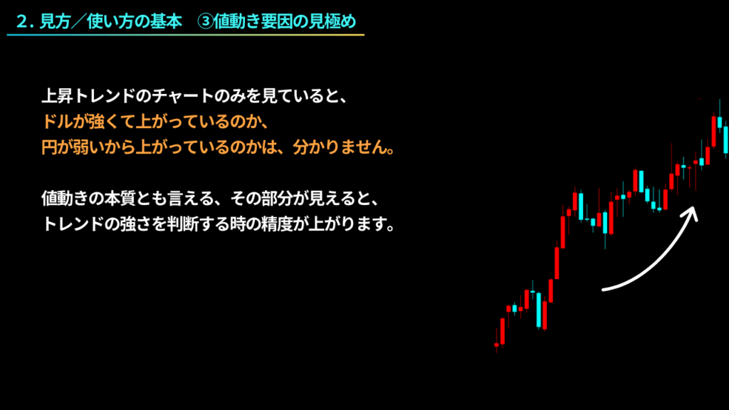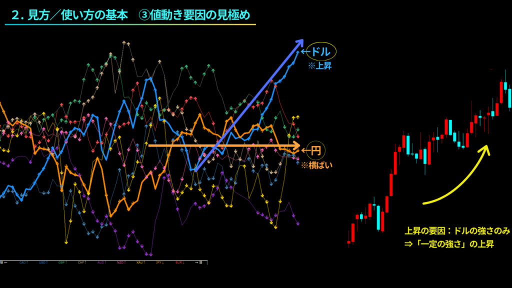 例えば、円の強さは横ばいで、ドルが強い場合、一定の上昇トレンドが発生している可能性が高いですが、この場合、ドルの強弱要因のみで上がっている状態と言えます。