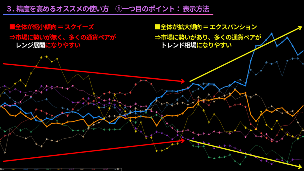 通貨強弱チャートにも、ボリンジャーバンドのように、縮小傾向、スクイーズと呼ばれる状態と、拡大傾向、エクスパンションと呼ばれる状態があります。
