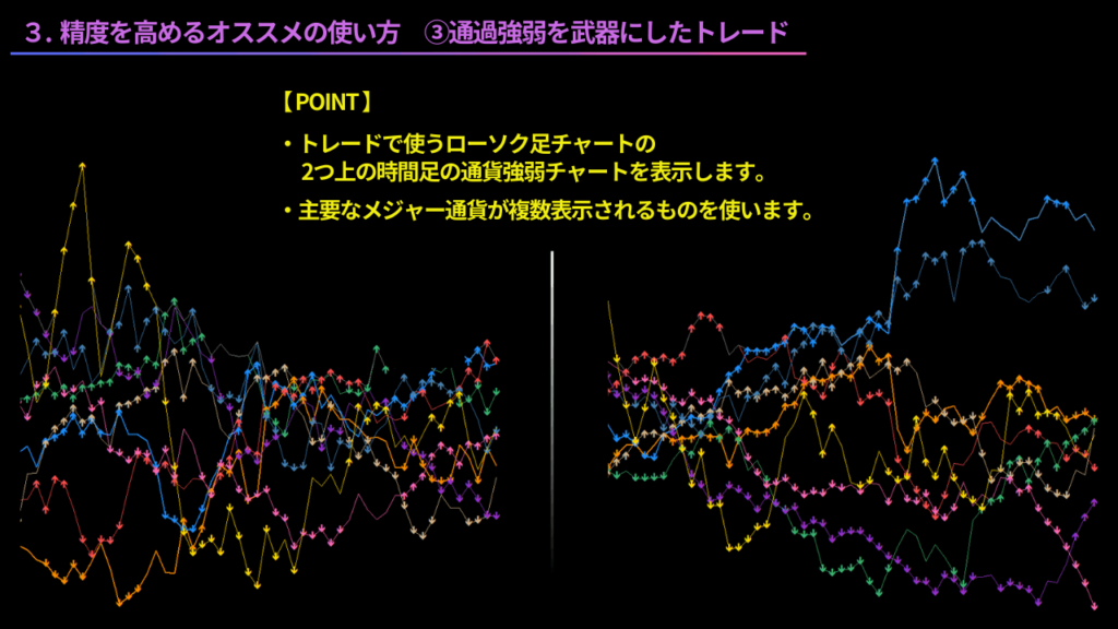 トレードで使うローソク足チャートの、2つ上の時間足の通貨強弱チャートを表示します。また、通貨強弱チャートは、主要なメジャー通貨が複数表示されるものを使います。