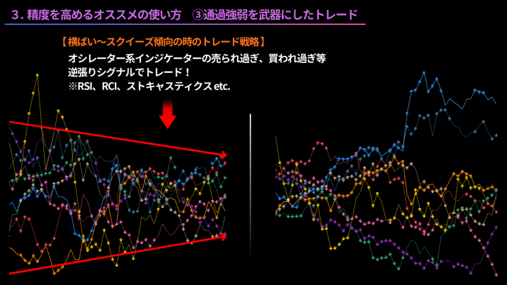 通貨強弱チャート全体が、スクイーズ状態の時は、多くの通貨がレンジ相場になりやすいため、オシレーター系インジケーターの、売られ過ぎ、買われ過ぎ等の逆張りシグナルでトレードします。(RSI、RCI、ストキャスティクス等)