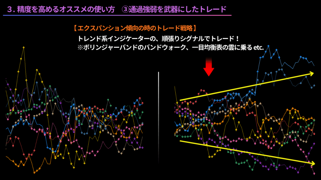 通貨強弱チャート全体が、エクスパンション傾向の時は、多くの通貨がトレンド相場になりやすいため、トレンド系インジケーターの、順張りシグナルでトレードします。(ボリンジャーバンドのバンドウォーク、一目均衡表の雲に乗る等)