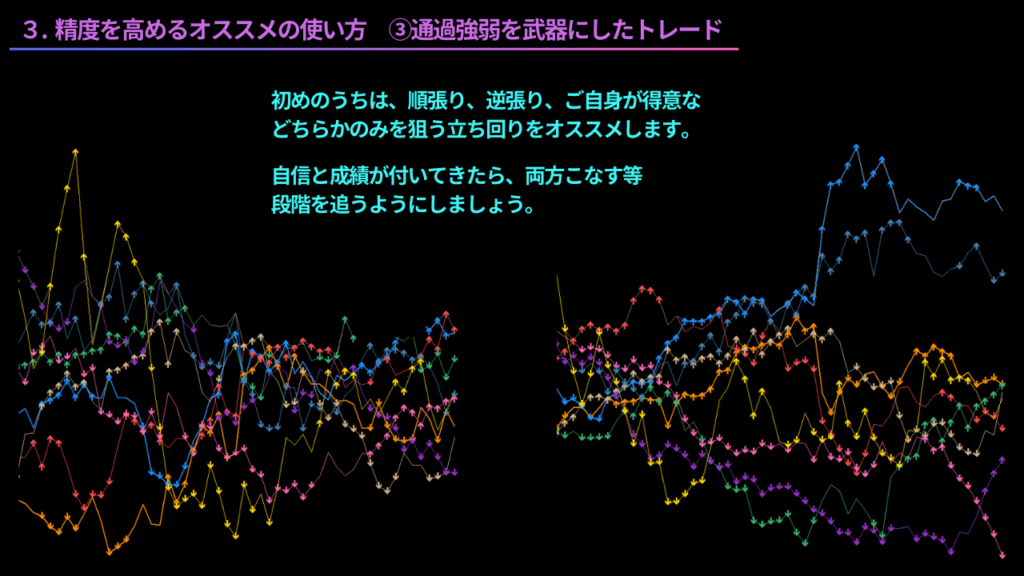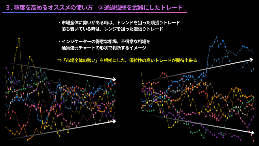 市場全体の勢いがある時は、トレンドを狙った順張りトレード、落ち着いている時はレンジを狙った逆張りトレード、という立ち回りです。インジケーターのシグナルには、得意な相場、不得意な相場があります。その相場状況を、通貨強弱チャートの形状で判断するという仕組みです。市場全体の勢いを根拠にした、優位性の高いトレードが期待出来ます。