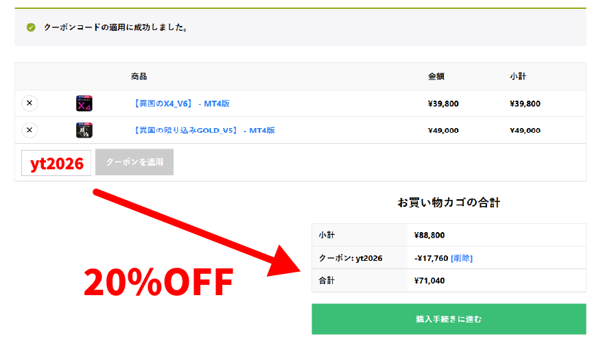 商品をカートに入れてチェックアウトに進むときに、クーポンコード「yt2026」を入力して適用すると、カート内の全てのEA商品が20%OFFとなります