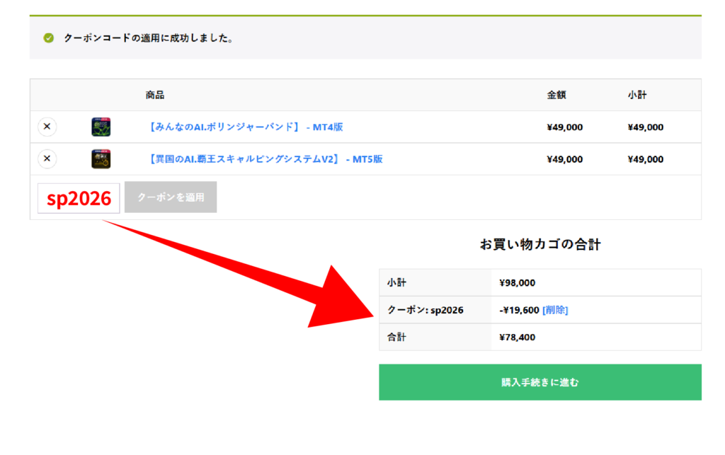 商品をカートに入れてチェックアウトに進むときに、クーポンコード「sp2026」を入力して適用すると、カート内の全てのインジケーター商品が20%OFFとなります。