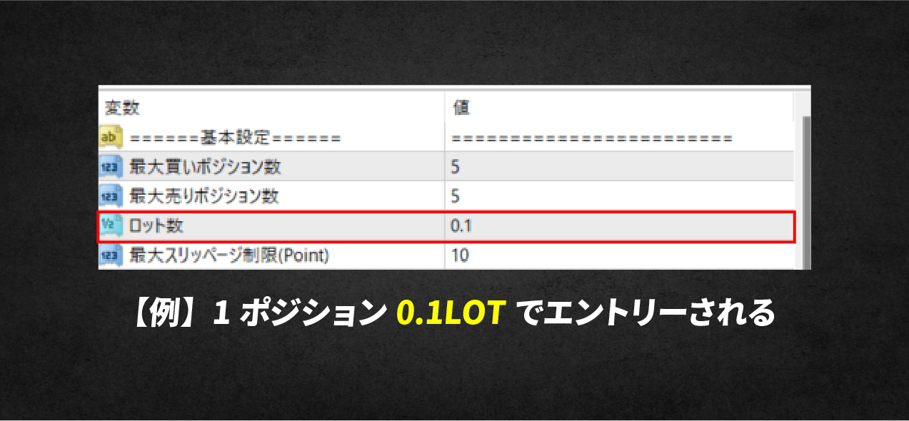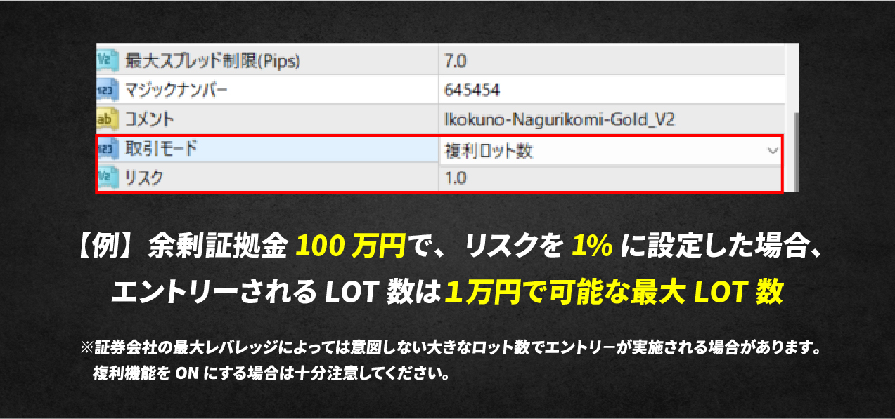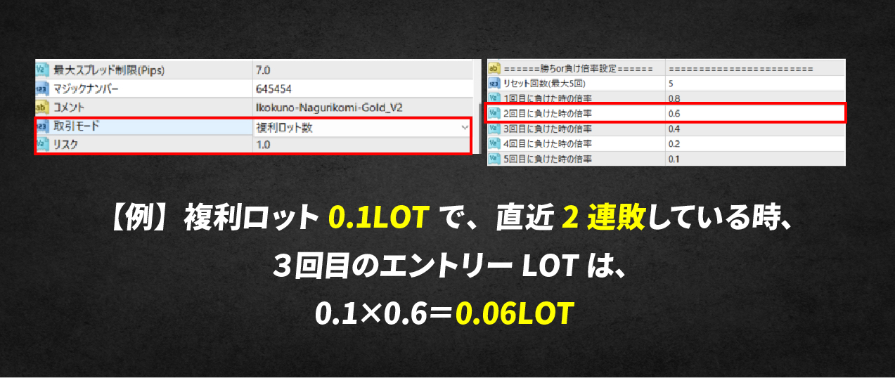 複利の力を利用して資金増加スピードを上げながら、連敗が続いた時と、複数ポジションを持つ時の2つの状況で、ロット数を調整することができます。