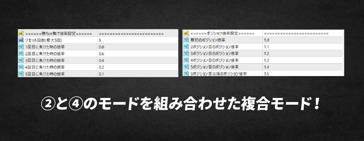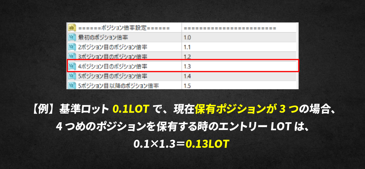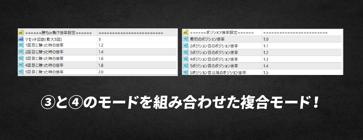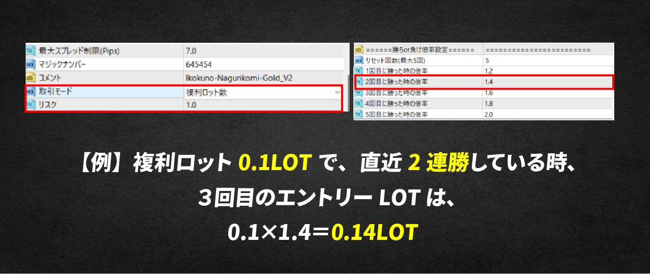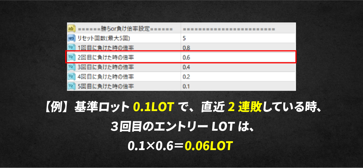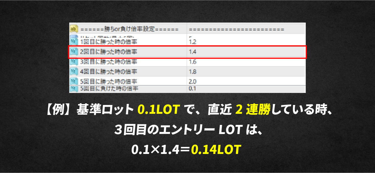 連勝が続いた時と、複数ポジションを持つ時の2つの状況で、ロット数を調整することができます。連続で勝った時にさらに利益を積み上げつつ、複数ポジションを持つ場合には、損益分岐点を効率的に引き下げたい、