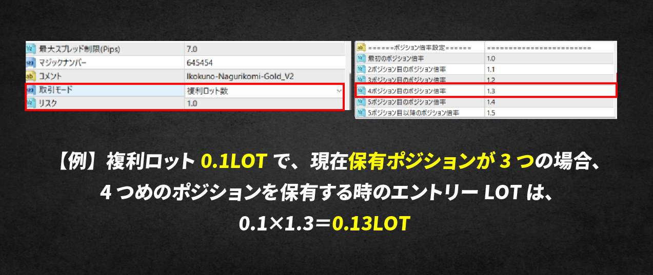 複利の力を利用して資金増加スピードを上げつつ、複数ポジションを持つ場合には、次のポジションで持つロット数を調整することができます。