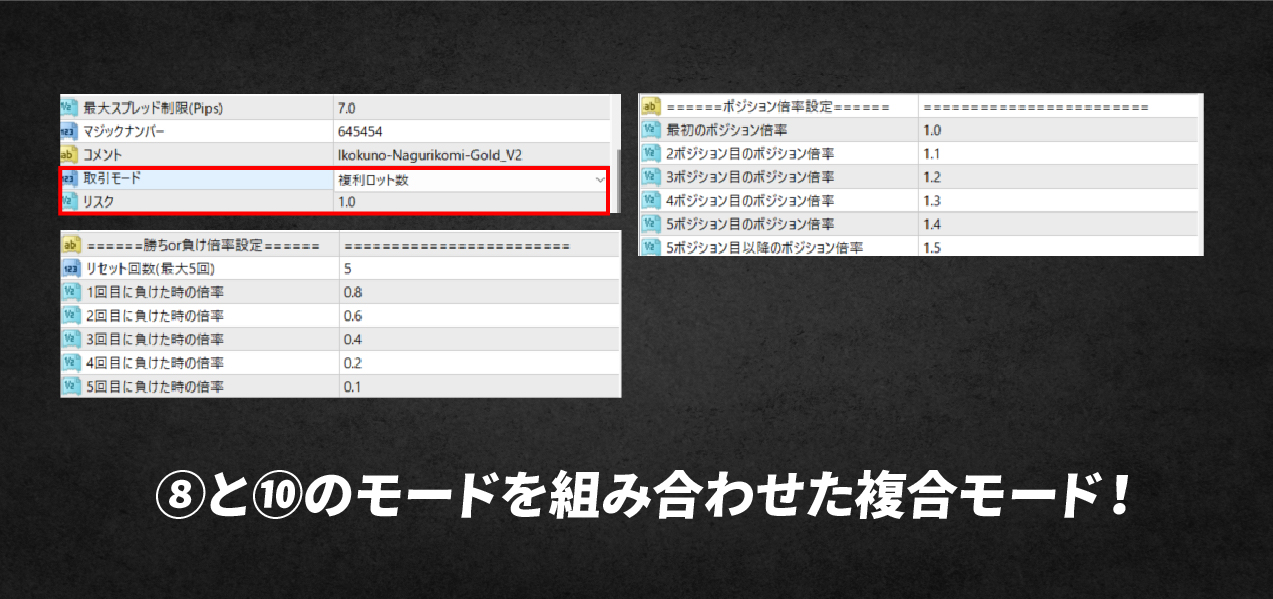 ⑩「複利ロット数」×「ポジション数倍率」