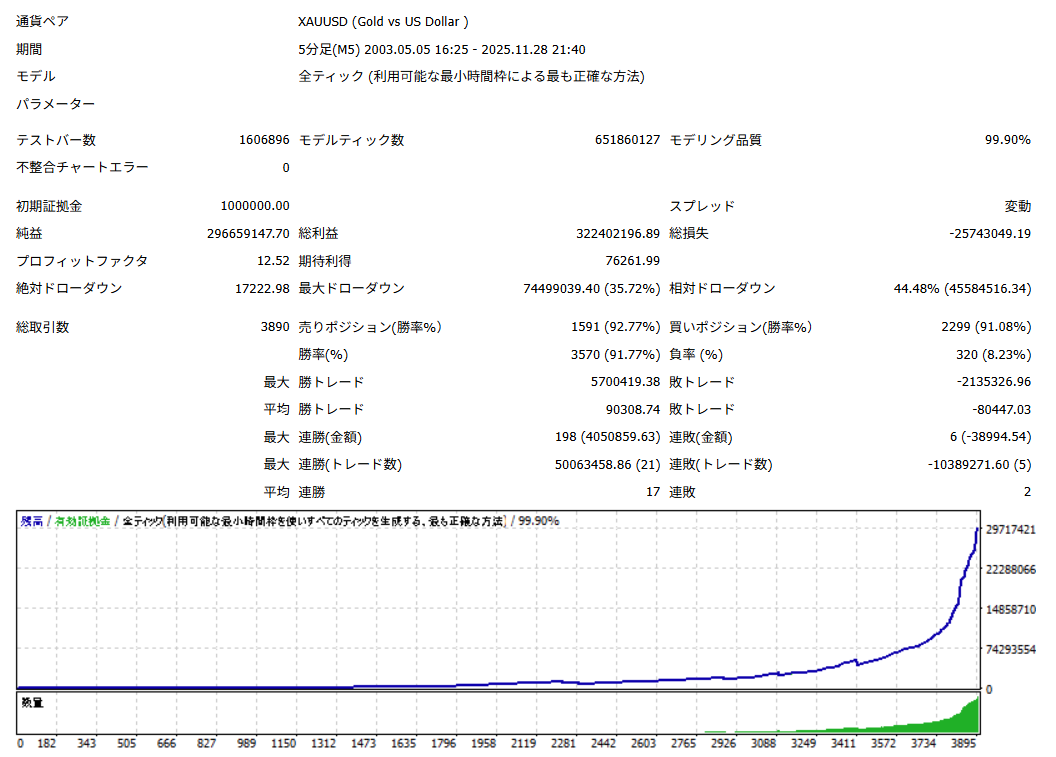EAは、長期間のバックテスト中に、およそ1500回以上の取引が行われていれば、信用できるロジックのEAと言われます。【異国の殴り込みGOLD】の取引回数は約3894回ですので、信頼できるバックテスト結果であることが分かります。