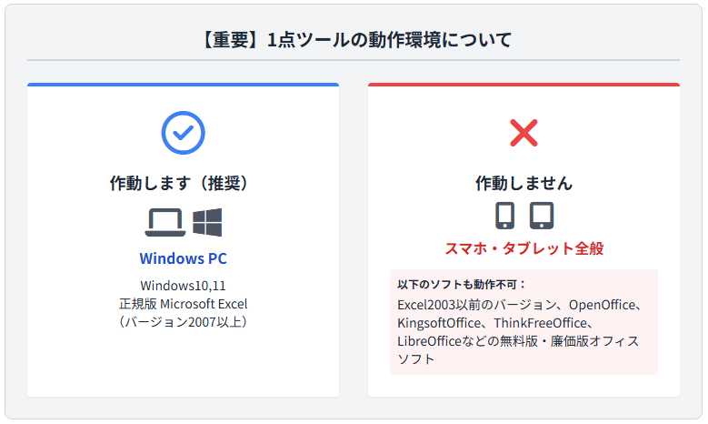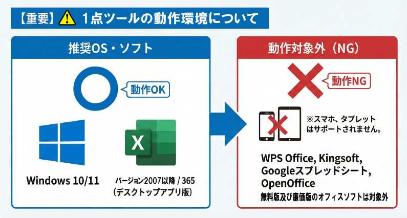 ただし、Excel2003以前のバージョン、OpenOffice、KingsoftOffice、ThinkFreeOffice、LibreOfficeなどの無料版及び廉価版のオフィスソフト及びタブレットやスマートフォンでは、1点ツールの機能が全く作動いたしません。