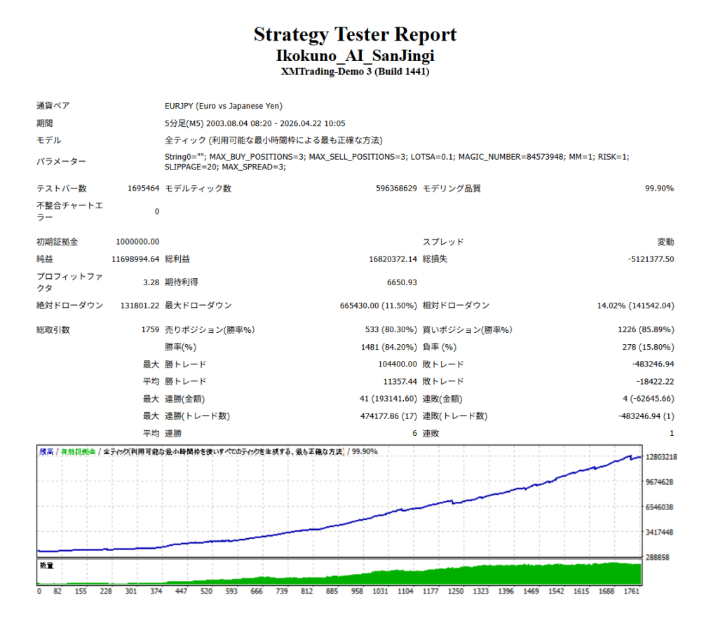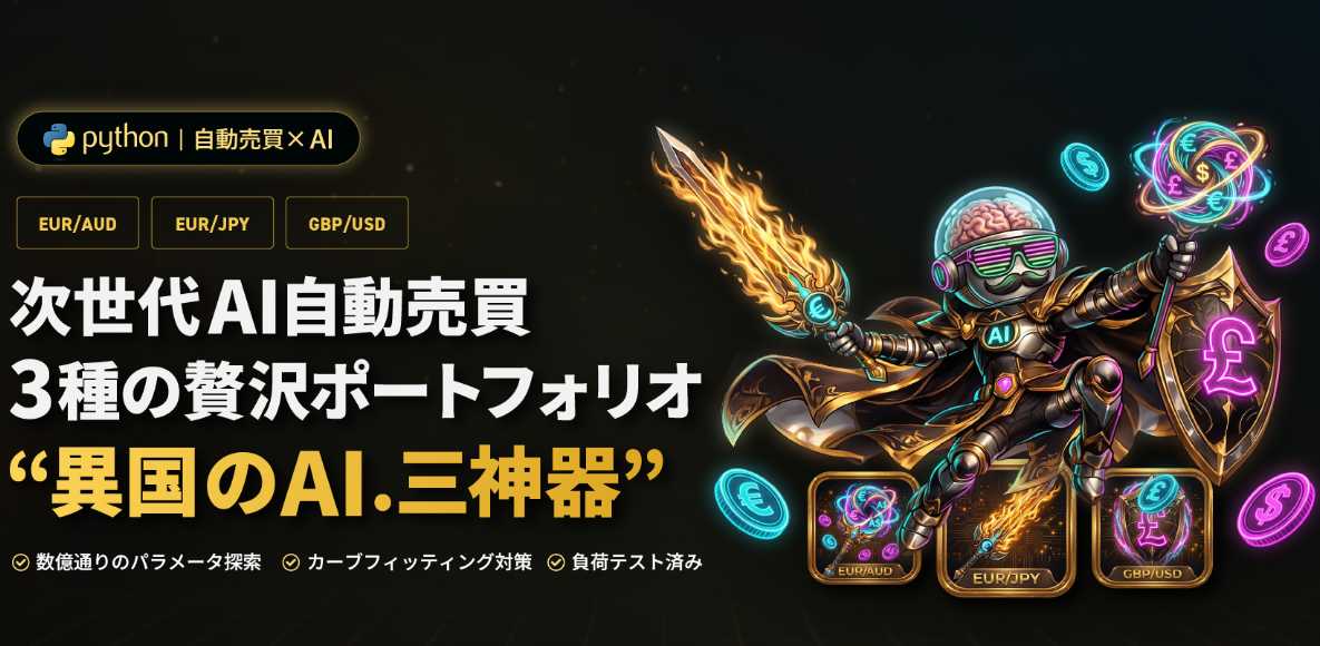 「異国のAI.三神器」はPythonとAI解析を活用した5分足専用EAです。EURAUD、EURJPY、GBPUSDの3通貨ペアによる分散運用で、リスクの低減を図ります。独自の負荷テストや検証により過学習対策を追求し、約22年間のバックテストでは純益約320万円、取引回数約5000回という結果を記録。マニュアル等のサポート面も充実しており、過去のデータに基づき運用の安定性を重視して設計されたシステムです。