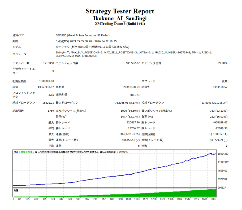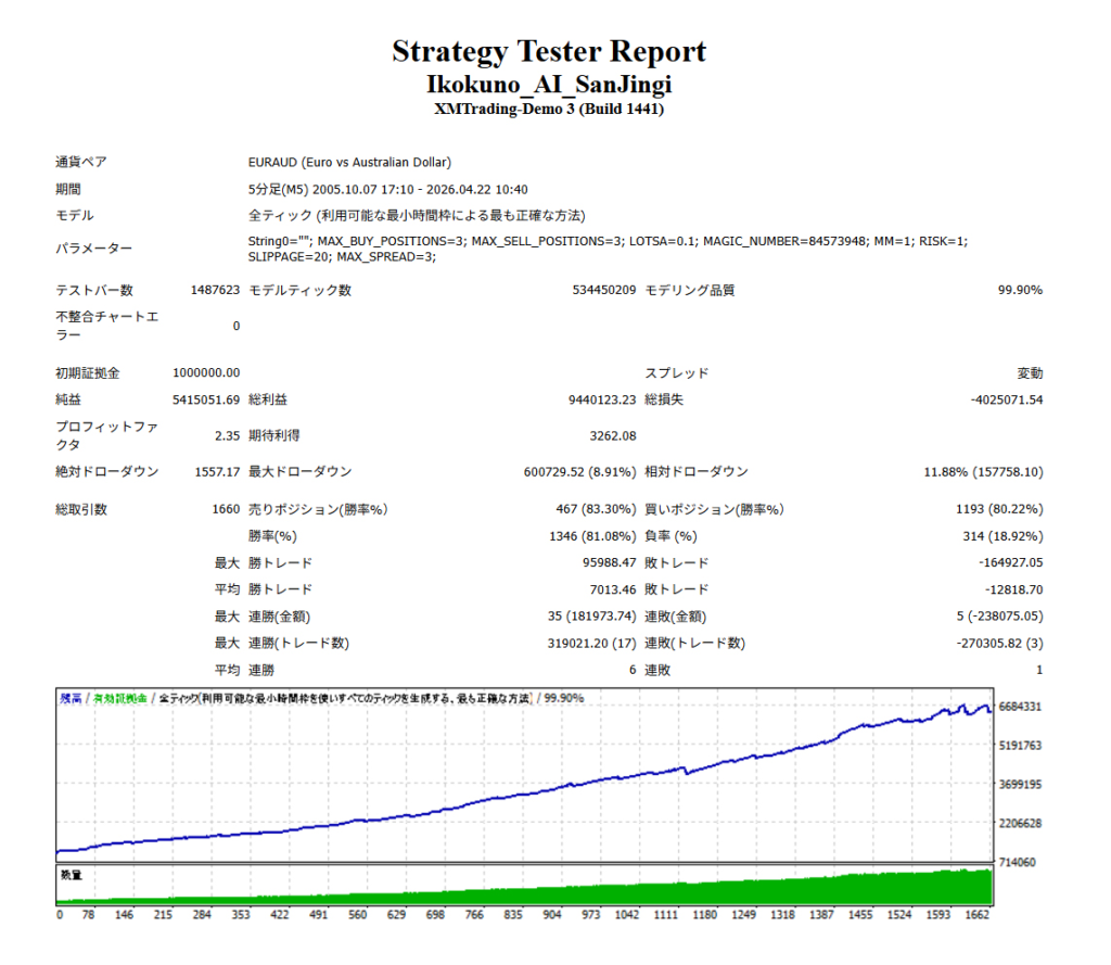 | 5分足 (M5) | 2003 – 2026 | 100万円 | 0.1 Lot 固定 | 変動(TDS) |