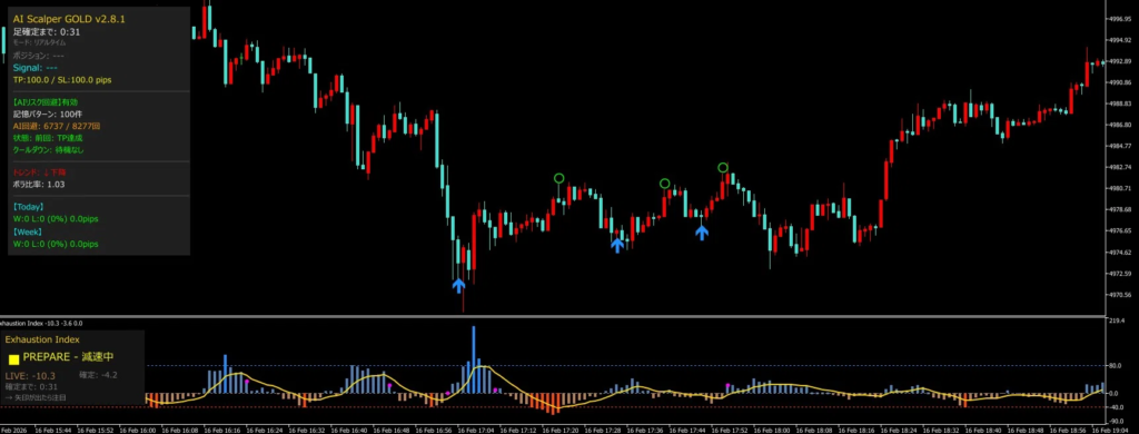 このシステムの特徴としては、過去のトレードデータから損失につながりやすいパターンをAIが学習し、同様の場面では「入るな」というフィルターが働く仕組みにあります。通常のシグナルツールがエントリー機会を増やす方向に機能するのに対し、この設計は「無駄なエントリーを減らす」という方向に働きます。