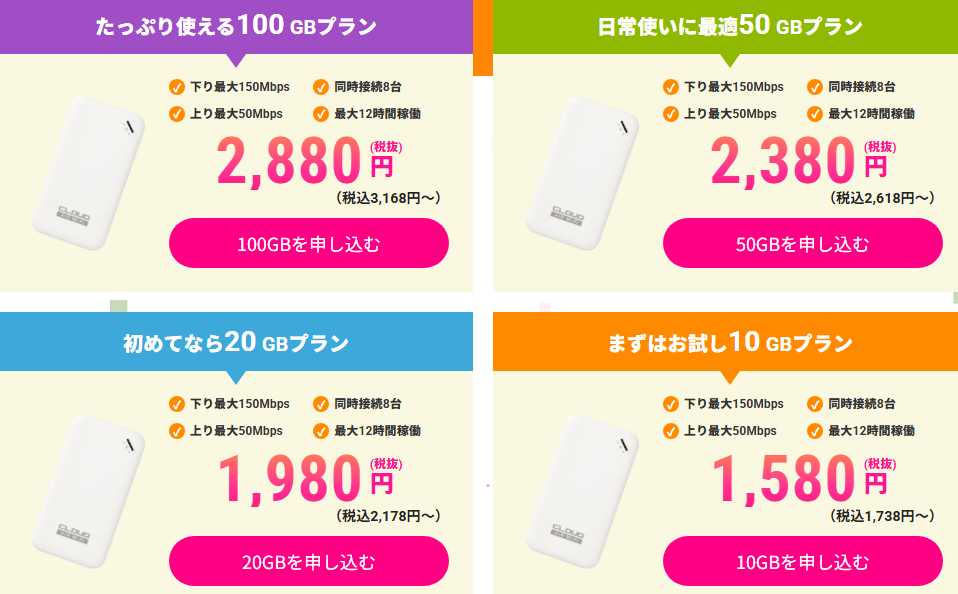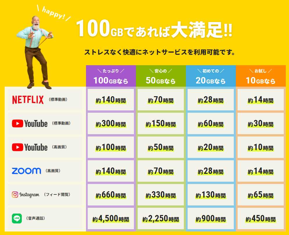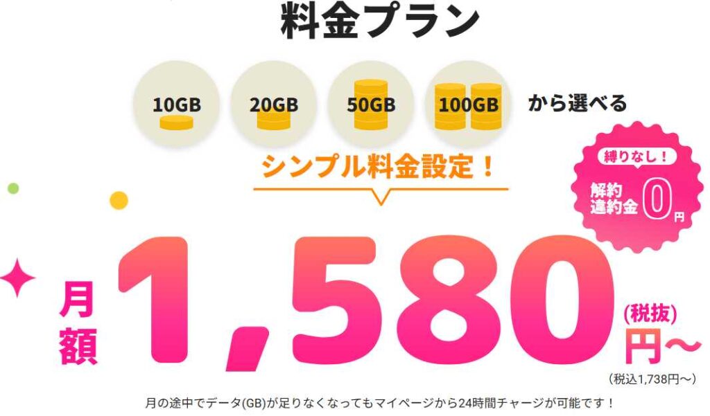 10GB~100GBまでの豊富なプランがあり、足りなくなったらデータチャージも可能。
