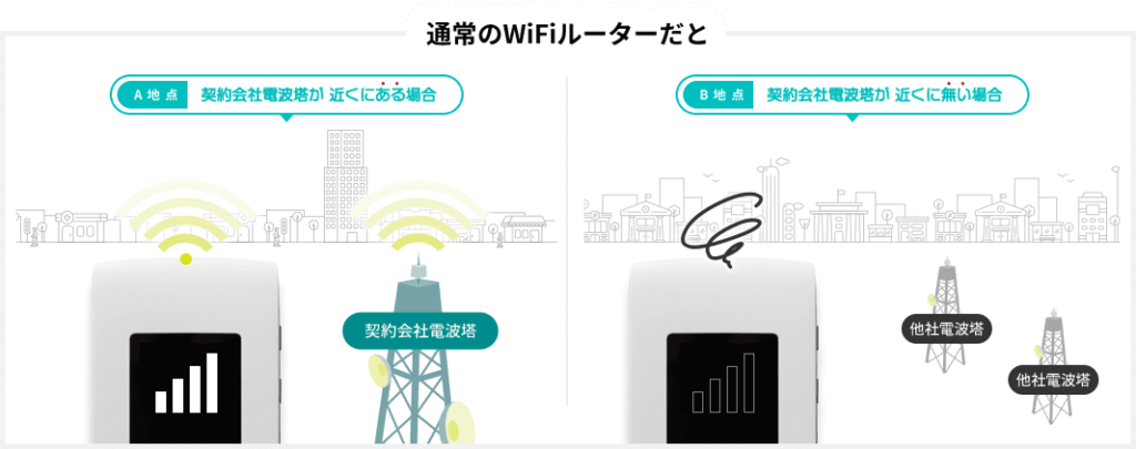 3社の電波を受信できることによって従来のポケット型WiFiで繋がりにくかったり、圏外表示になる郊外、山間部や建物の地下などでも比較的繋がりやすくなります。